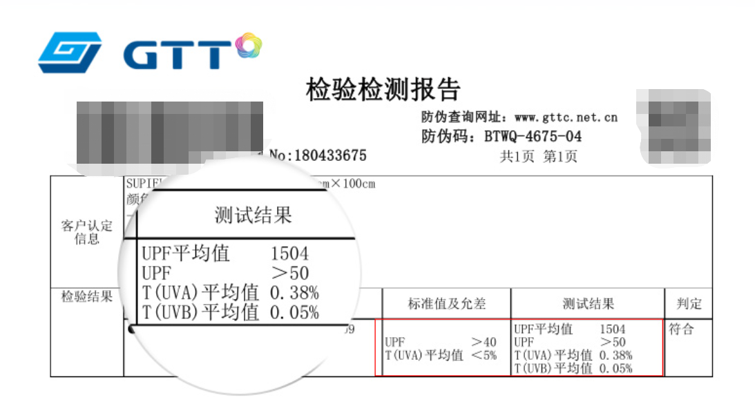通過專業(yè)機構(gòu)的檢測,衣服的UPF平均值超過了1500,而國標的要求是UPF大于40,超過了國標的37倍。