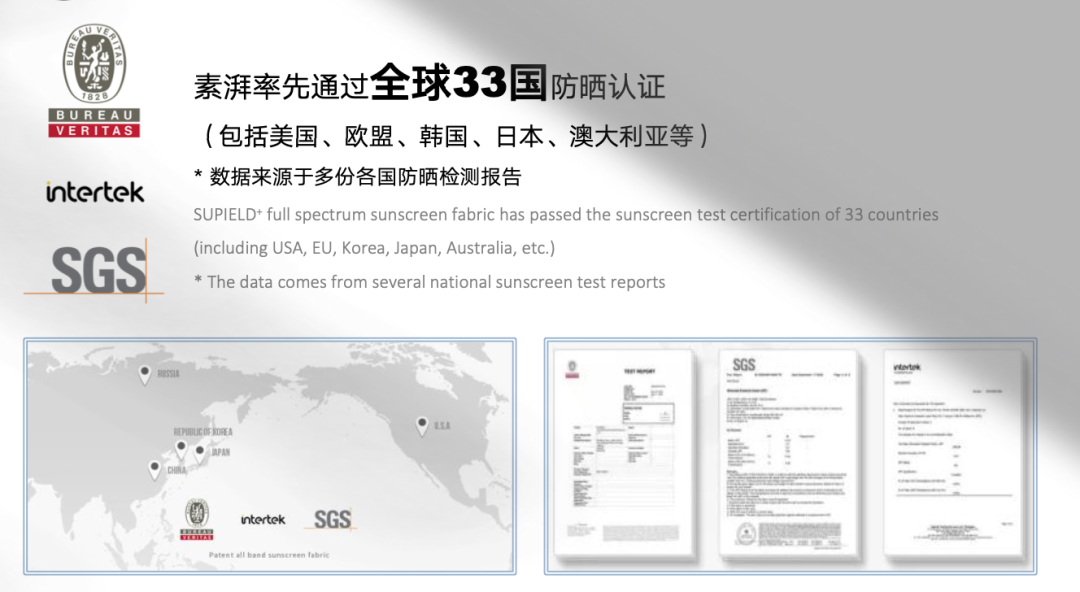 不僅如此,素湃防曬衣還通過了各種第三方專業(yè)測試機構(gòu)的嚴苛測試,有BV、intertek、SGS等,并且在包括德、日、美等33個都通過了認證。