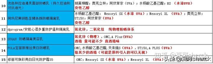 接下來就給你們列些,每個防曬的防曬劑還有酒精添加情況。