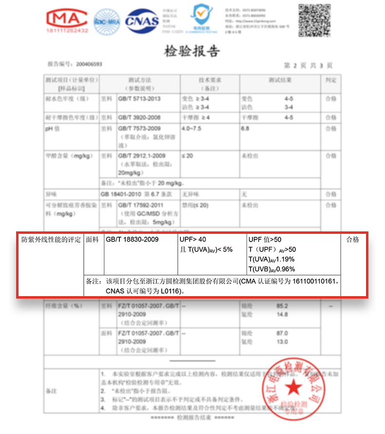 根據(jù)我國(guó)《紡織品防紫外線性能的評(píng)定》規(guī)定,UPF>40,且T(UVA)平均值小于5%,才能稱為“防紫外線產(chǎn)品”。