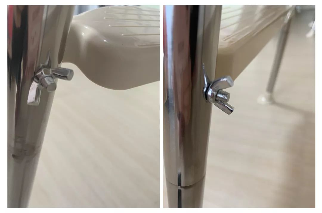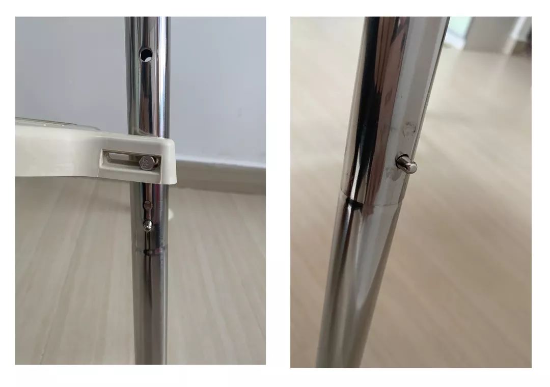 ②除宜家外,其他5款餐椅的椅腳均為拼接式。椅腳和支撐管的連接只是通過簡單拼插的方式,而椅腳本身的重量又輕,所以經過長期的搬移后,可能會發(fā)生椅腳脫落的風險。