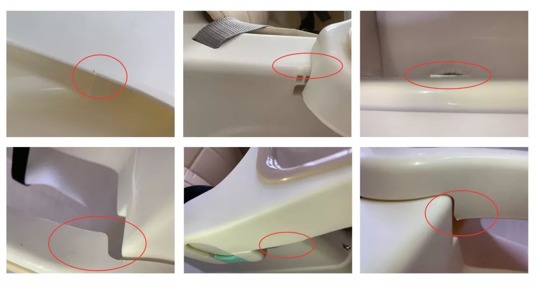 ③6款寶寶餐椅的餐盤、靠背、腳踏等處,均發(fā)現(xiàn)了粗糙的、邊緣凸起的毛刺,有的還比較尖銳。