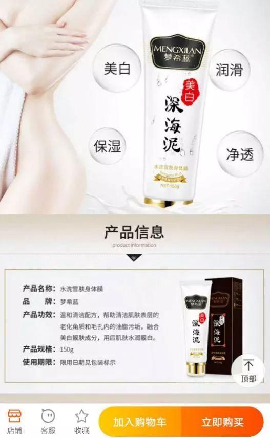 品牌為“夢希藍”的“美白潔面乳”,在店家展示的產(chǎn)品信息圖片中卻標(biāo)示產(chǎn)品名稱為“水洗雪膚身體膜”。