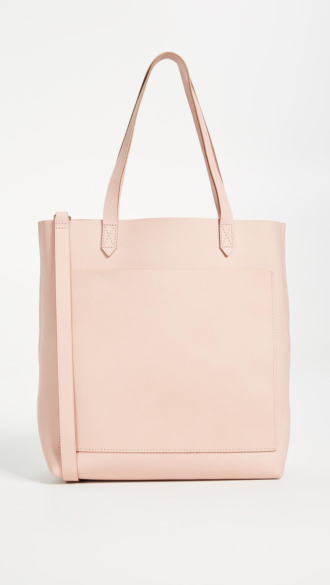 這一類托特包通常包口比上一款略微狹窄一些,大部分可以單肩背,因?yàn)槠洫M長(zhǎng)的造型在視覺(jué)上搭配空間更大。madewell的totebag就是這一類包的典型代表:
