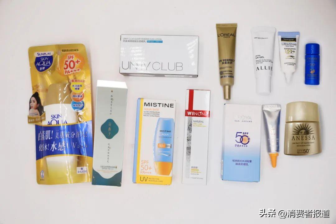 測(cè)試品牌安熱沙ANESSA、歐萊雅、露得清、資生堂、薇諾娜、珀萊雅、ALLIE皚麗、MISTINE蜜絲婷、UNNY CLUB悠宜、花西子、934、新碧