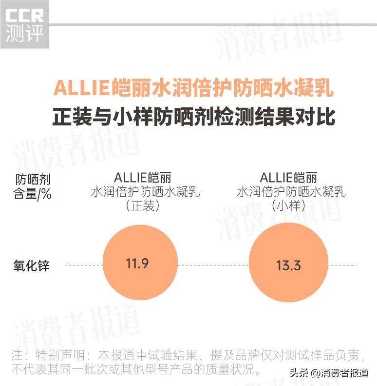 除了安熱沙,還有歐萊雅、ALLIE皚麗兩款產(chǎn)品的正裝與小樣防曬劑含量有些微差別,差距均在1%左右。