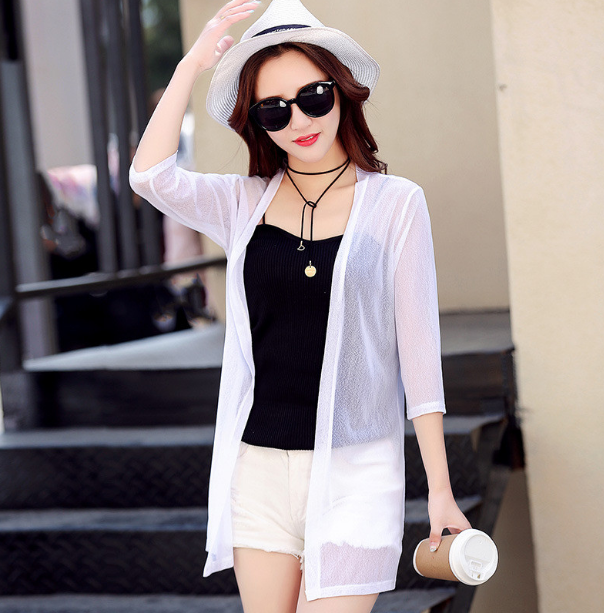 這種紗網(wǎng)款防曬衣是很百搭的一款,無論里面穿的吊帶背心+短褲,或是吊帶裙,將它穿在外面都好看,主要紗網(wǎng)很透氣哦!