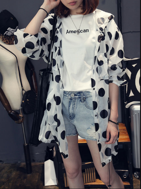 波點圖案一直給人以很活潑的感覺,波點樣式的長款防曬衣更讓人有種眼前一亮之感,黑白波點防曬衣+白T+藍色牛仔短褲,很涼爽的感覺有木有?
