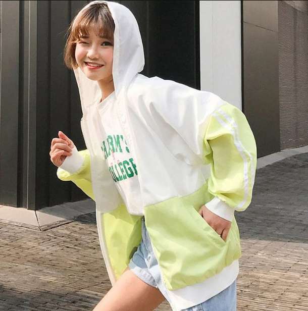 白+綠拼色的夾克版防曬衣,是大多數(shù)學(xué)生一族的愛,顏色干凈清涼,搭配一件T恤和牛仔短褲也舒服,出游還用說,就它了!
