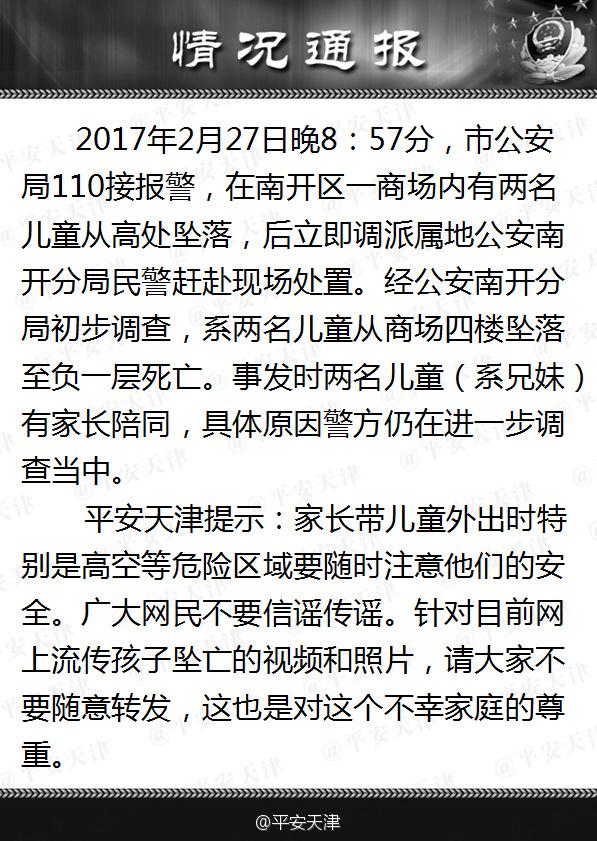 2月27日晚,天津大悅城2名孩子從4樓掉落至負(fù)一層,當(dāng)場死亡,事發(fā)孩子家長手抱孩子靠近玻璃圍欄天井處,一時沒抱住孩子致悲劇發(fā)生??!再次提醒各位家長,帶孩子外出,一定看護好孩子,預(yù)防意外事件發(fā)生!