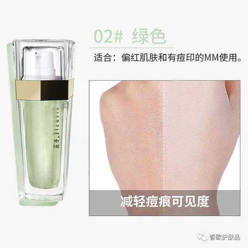 綠色:色彩學(xué)中,綠色的對比色是紅色!綠色隔離霜可以中和面部過多的紅色,使肌膚呈現(xiàn)亮白的效果。另外,還可有效減輕痘痕的程度。 適合偏紅肌膚和有痘痕的皮膚。