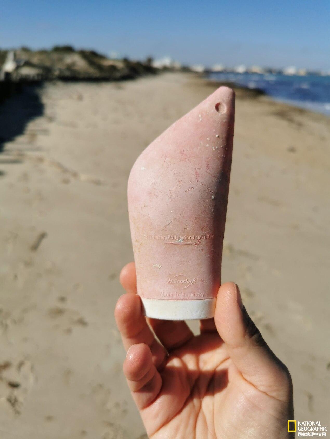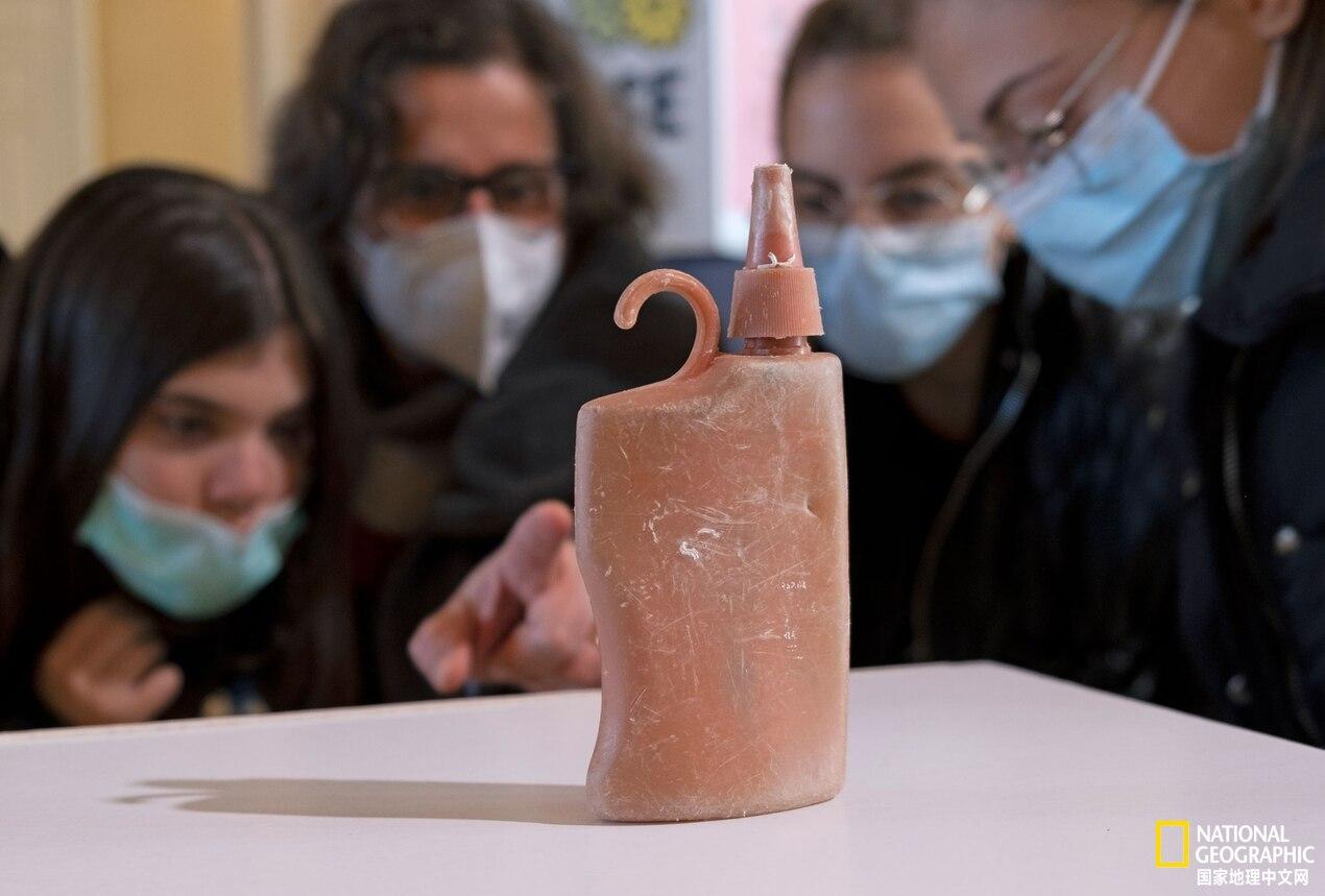 一個(gè)20世紀(jì)70年代初的塑料防曬瓶。這個(gè)瓶子被沖上意大利海岸之前在海洋中漂了幾十年,現(xiàn)在是“塑料考古”博物館(Archeoplastica)的一件藏品。攝影:ENZO SUMA, ARCHAEOPLASTICA
