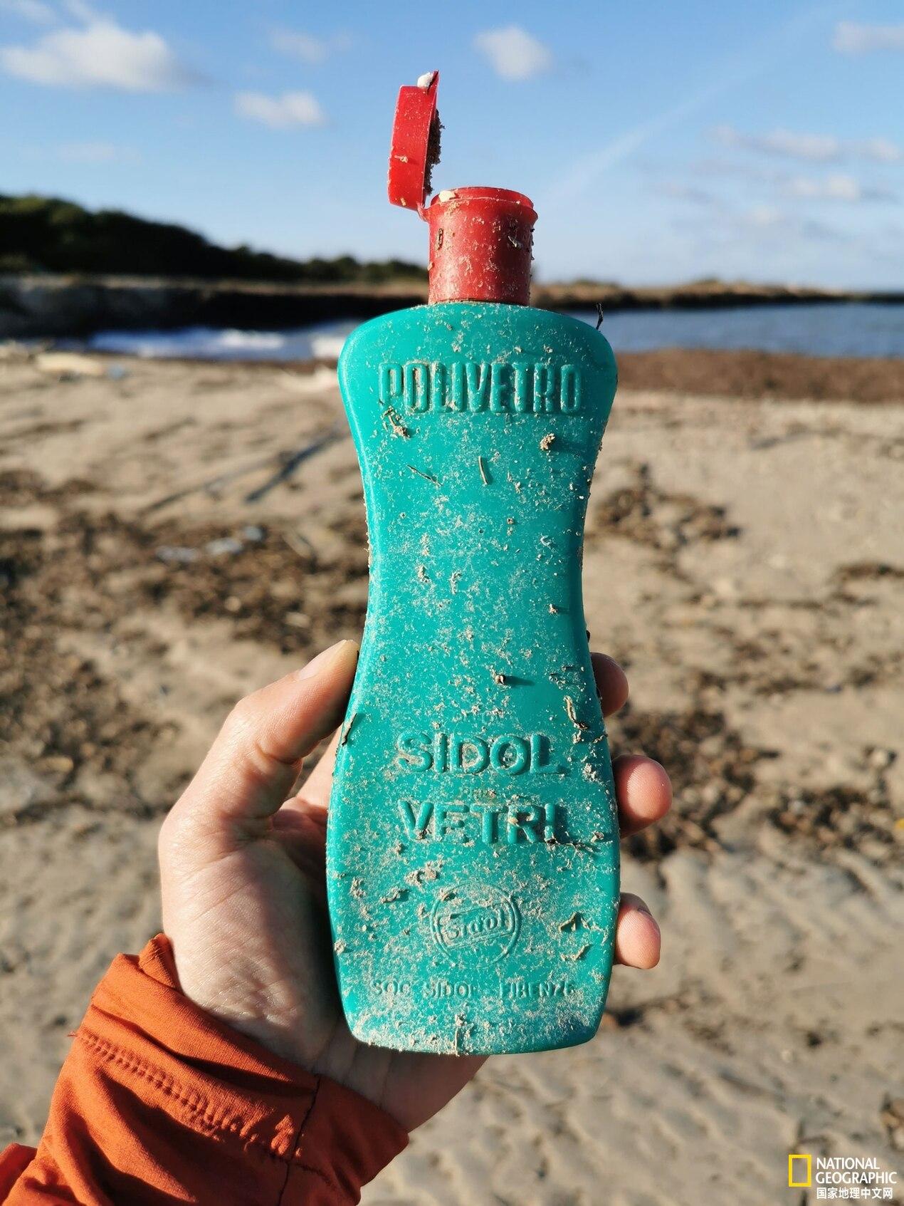 Polivetro是20世紀(jì)60年代至70年代流行的玻璃清潔劑,至今還會(huì)被沖上意大利普利亞的海岸。攝影:ENZO SUMA, ARCHAEOPLASTICA