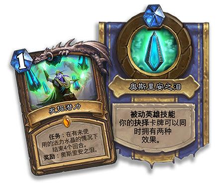 任務(Quest):和現(xiàn)有的任務牌一樣,這些法力值消耗為(1)點的傳說卡牌會出現(xiàn)在起始手牌中,使用后會在英雄頭像上方追蹤任務進度。完成任務即可獲得足以改寫局勢的全新英雄技能。