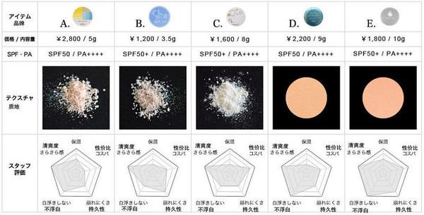 既然是粉末型防曬,清爽度方面都是很不錯的,但是保濕方面肯定就有點(diǎn)不足了,不過五款相比A款ETVOS Mineral UV Powder(2015)和E款MSH Time secret mineral UV Powder的保濕相對較好。持久性方面,五款也相差較大,B款Privacy UV face powder 50 Four Plus和E款MSH Time secret mineral UV Powder相對持久性較好。從性價比方面來看,性價比較高的是C款Paseo UV cut powder Normal和E款MSH Time secret mineral UV Powder。