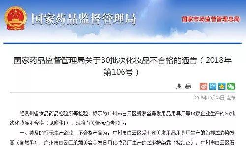 10月30日,藥品監(jiān)督管理局官網(wǎng)發(fā)布通告稱,經(jīng)貴州省食品藥品檢驗(yàn)所等檢驗(yàn),標(biāo)示為廣州市白云區(qū)愛夢(mèng)絲美發(fā)用品用具廠等14家企業(yè)生產(chǎn)的30批次化妝品不合格。