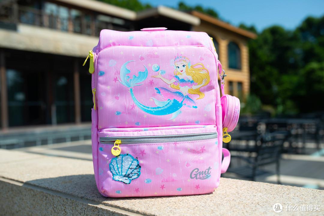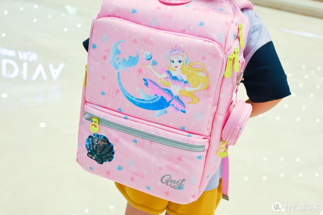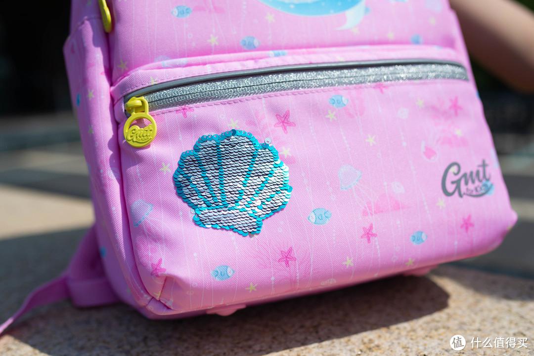 這款GMT小方包的配色豐富,配色達到了十多款。我入手的是淺粉美人魚配色的,顏值不錯,漸變配色,幻彩底紋。正面整體的樣子。方方正正,正面由上下兩個半?yún)^(qū)組成,分別可以放置不同的物品。可以將文具盒和日常用品分開擺放。底部袋子外面,還有一個亮片組成的貝殼圖標。右側是一個反光LOGO,在被汽車燈光照射之后,會出現(xiàn)反光亮點,保護孩子。圓形的拉鏈,既不會傷害小朋友,而且這樣的設計可以保持拉鏈部分的美觀。