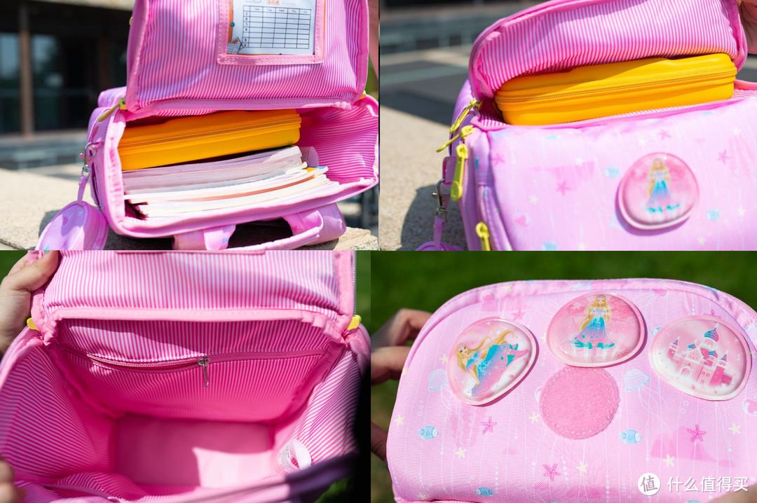 GMT for Kids 兒童護脊書包一共有六大功能口袋。書包尺寸27*14*41CM,容量達到了22L。兩側袋子(玩偶處),可以放入保溫杯,雨傘,等等經(jīng)常需要拿出的物品。頂部袋子,可以放入文具盒,或者放入筆袋等等物品。書包寬度適合A4大小的書本。書包體積很大。容量還是給力的。