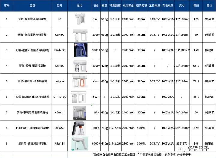 次氯酸的儲存和注意事項次氯酸消毒液的確定是不穩(wěn)定性需要特別注意儲存方法:次氯酸消毒液的儲存庫溫應低于30°C,相對濕度不應超過81%,應該保持密封。次氯酸對直射陽光(紫外線)敏感,家庭使用的次氯酸消毒液開蓋后應盡快密封,請避開室外或高溫場所在陰冷處保管。因與空氣接觸會加速衰減的特性,開封后應盡快用盡,且不宜大量儲存以及久存。如何選購消毒噴霧槍?當我們選擇好消毒液后,回到消毒噴霧槍的選購,應該怎樣選購呢?選取目前在電商平臺銷量比較高的一些噴霧槍進行橫向對比。
