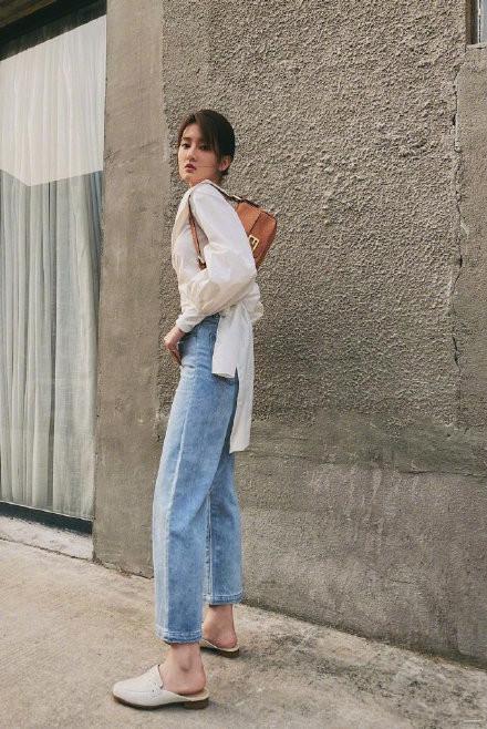 look4白色襯衣+牛仔蘿卜褲韓系輕熟風的穿搭適合25-30歲左右的女孩子,日常或者職場通勤都可以,氣質(zhì)又淑女,喬欣身穿一件白色泡泡袖襯衣,搭配一條淺藍色的牛仔蘿卜褲,搭配一個低馬尾,知性又靚麗,氣質(zhì)真的太好了。泡泡袖襯衣和普通襯衣不同,帶有一種復古的宮廷感,背上一個棕色的小方包,簡單又高級。