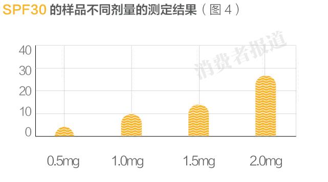 劉瑋院士新的研究指出,不同用量能夠?qū)崿F(xiàn)的防曬指數(shù)是有很大差別的,以常見的SPF30 的產(chǎn)品為例,如果消費者只用1.0mg/cm2,終只能實現(xiàn)SPF10的效果。(如圖2,3,4,5)