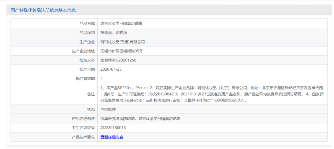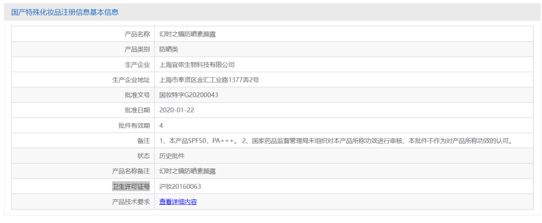 不過,在藥監(jiān)局官方上查到該噴霧產(chǎn)品有專屬的特證國妝特字G20203062,有效期是4年,所以這兩個產(chǎn)品并沒有用同一特證。