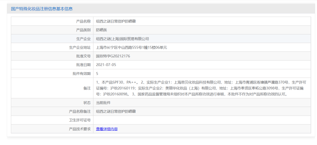 在進入藥監(jiān)局平臺查詢后,發(fā)現(xiàn)該品牌在2021年重新注冊了國妝特字G20212176,產(chǎn)品名稱是日常倍護防曬霜??梢?,在文章發(fā)布前,該品牌日常倍護防曬霜的天貓詳情頁沒有及時更新,確實需要做出相應解釋和改進。