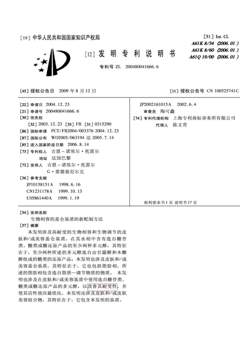 * D.A.F.皮膚科學(xué)高級配方發(fā)明專利號:ZL200480041666.6