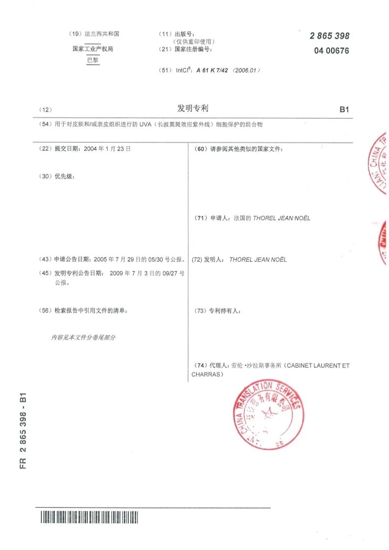 * 法國細(xì)胞防護(hù)發(fā)明專利號:FR2865398-B1
