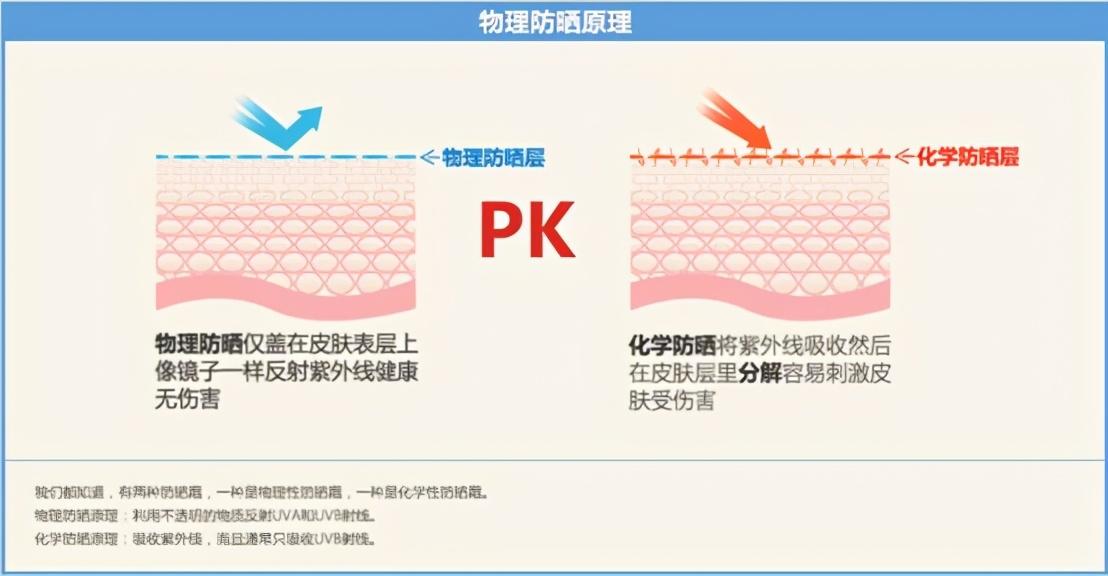 一般劃分成化學(xué)防曬和物理防曬。簡單來說,化學(xué)防曬靠二苯酮、水楊酸乙基己酯等吸收紫外線來進行防曬,而物理防曬靠的是折射紫外線,現(xiàn)在防曬種類越來越多,也不乏化學(xué)和物理防曬方式相結(jié)合的。