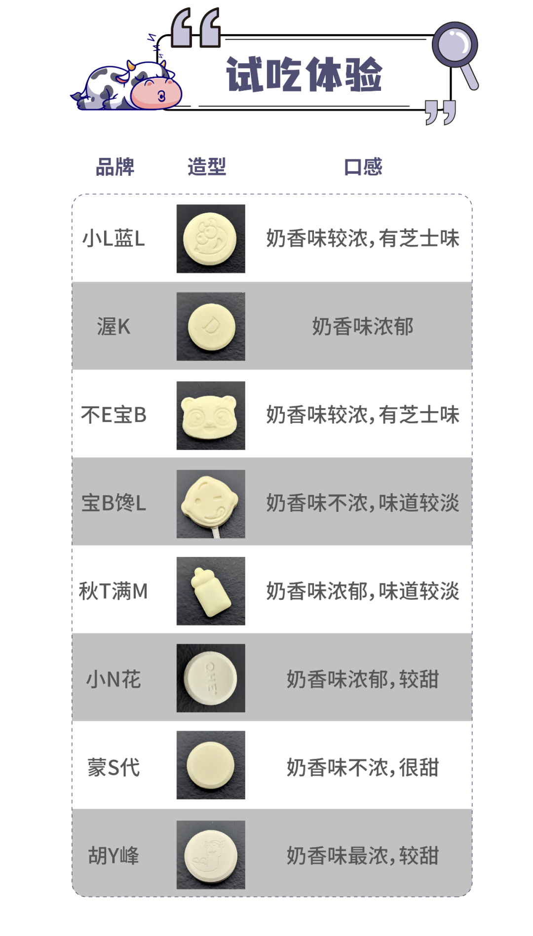 試吃體驗(yàn)花爸請辦公室同事試吃了8款奶片,并對它們的味道進(jìn)行評價(jià),總結(jié)如下: