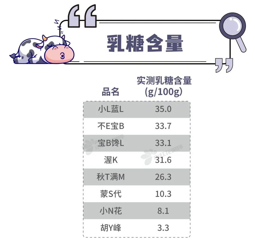 乳糖含量高,說明奶片添加的乳粉多。果然,8款奶片的乳糖含量排序,和蛋白質(zhì)含量幾乎一樣。