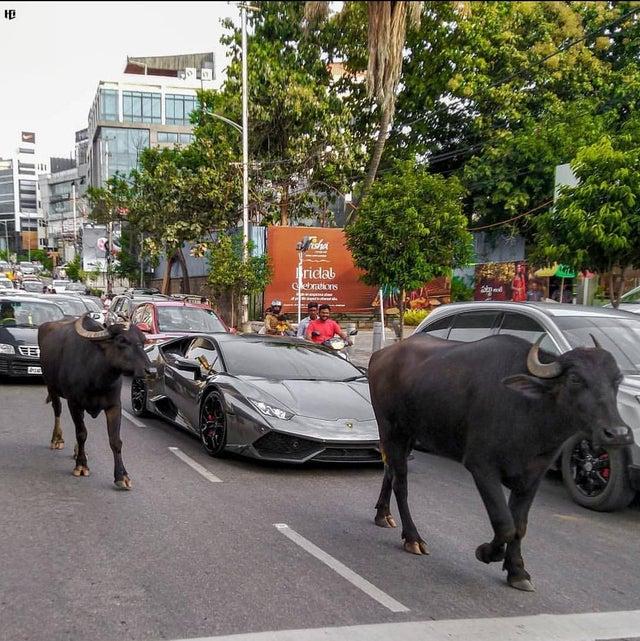 印度街頭一幕,蘭博基尼與牛一起在馬路上馳騁。