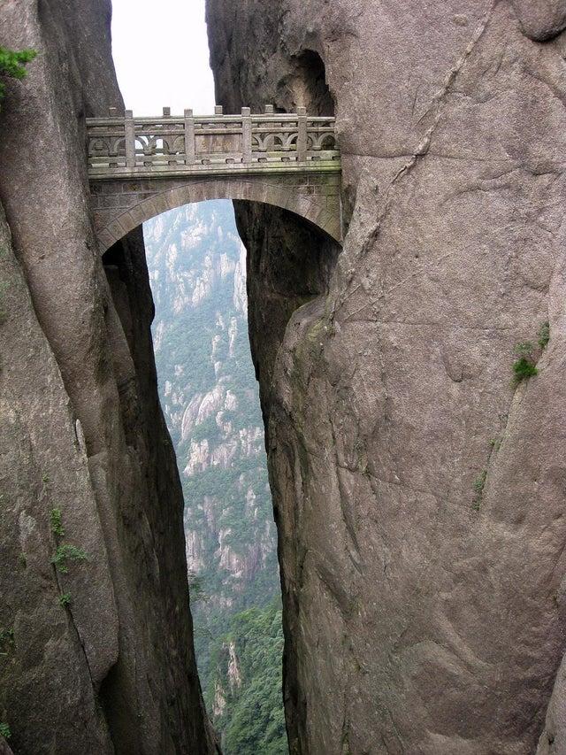 一座古老的橋梁,從兩個石頭中間穿過。