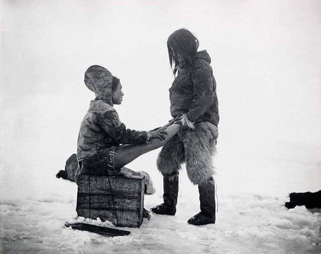 因紐特人為妻子暖腳。格陵蘭島,1880—1890 年代。攝影師 Robert E. Peary/地理