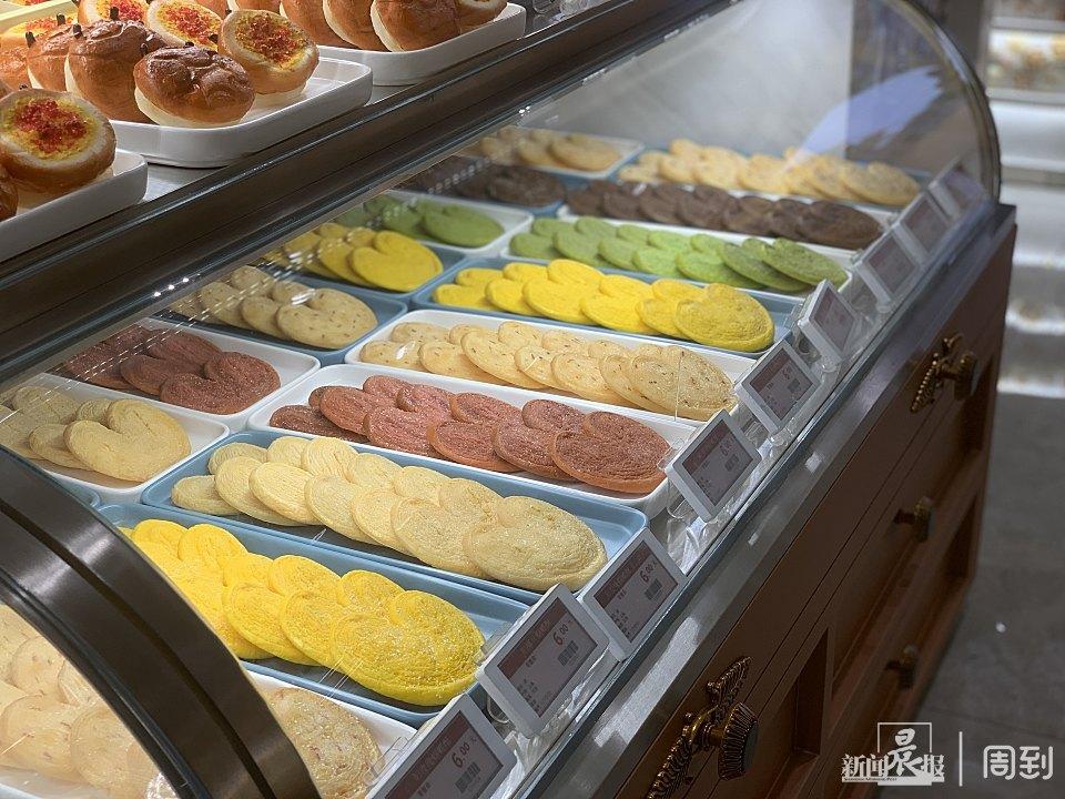 又比如這款新品“蟹黃酥”,原料為蟹黃、魚子,配上稍許的醋和姜,給顧客一種吃蟹的感覺,“上海人本來就喜歡吃蟹,我們也是迎合他們的喜好,進(jìn)行創(chuàng)新?!钡觊L解釋道;“七色蝴蝶酥”也是新店,相較于老店只有原味蝴蝶酥,新增了玫瑰、椰絲、蛋黃、蔥香、抹茶、巧克力等六個口味的蝴蝶酥,不僅好看,且味型更豐富。