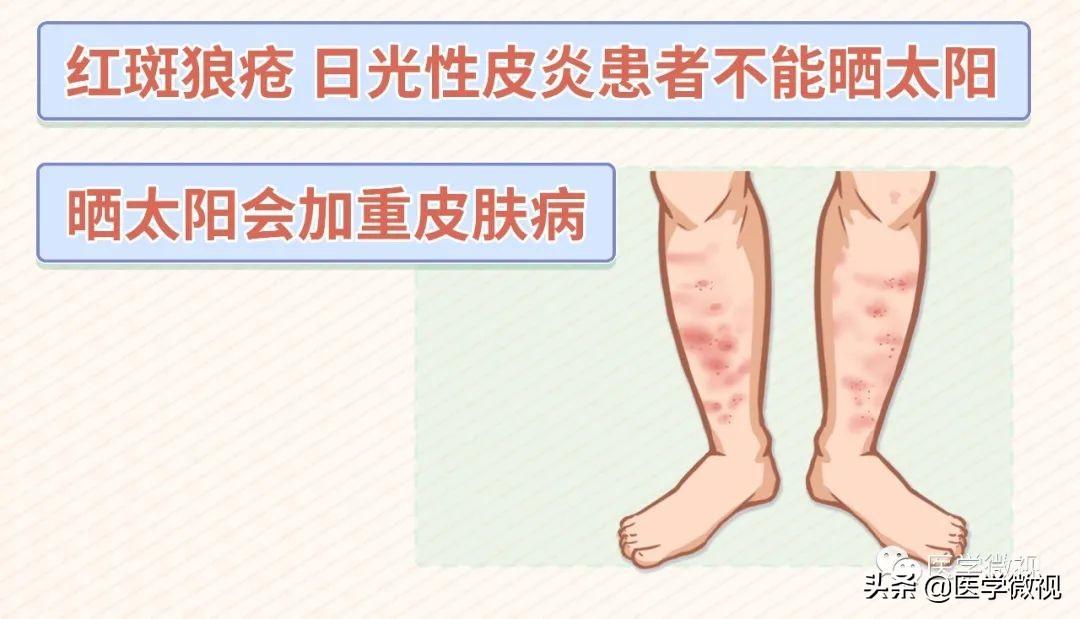 后提醒一點(diǎn),如果自身存在紅斑狼瘡、日光性皮炎等皮膚病,或正在服用一些容易引起皮膚光敏感的藥物,比如四環(huán)素類、磺胺類藥物等,則應(yīng)該盡量避免日曬,以防病情加重。