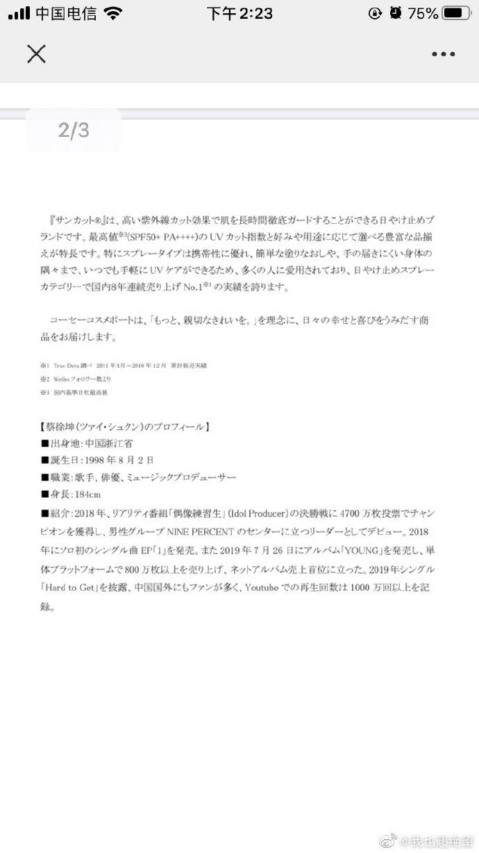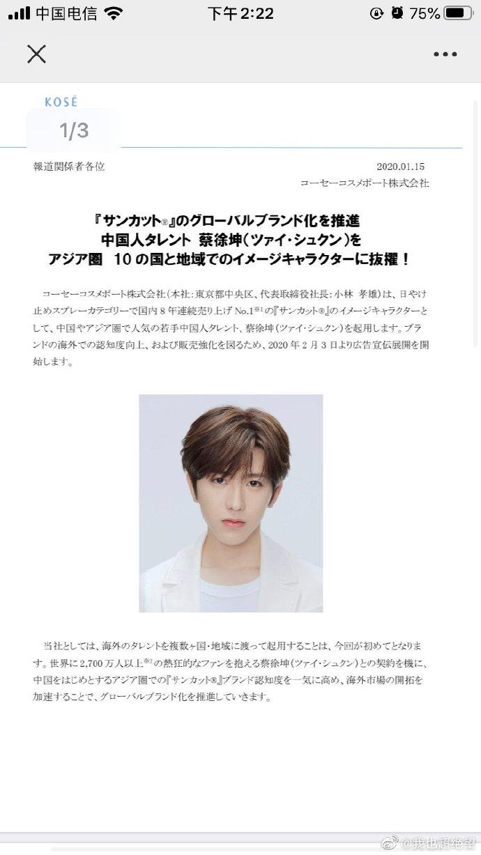 原文報(bào)道翻譯:報(bào)道有關(guān)人員各位2020.01.15高絲化妝品株式會(huì)社『sankat』中國(guó)甚至亞洲圈中很受歡迎的年輕中國(guó)藝人蔡徐坤被起用為日本國(guó)內(nèi)連續(xù)8年銷量No.1的“suncutの”品牌代言人。為了提高品牌在海外的認(rèn)知度且加強(qiáng)銷售,將于2020年2月3日開始開展一系列廣告宣傳