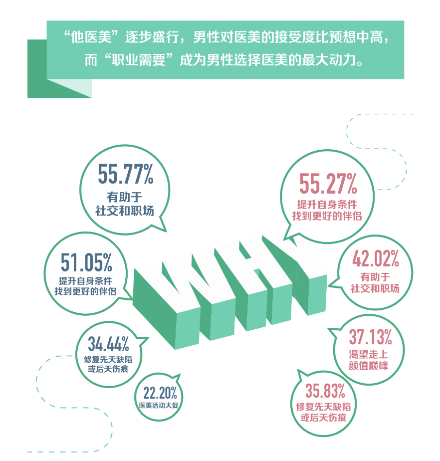修復(fù)缺陷、提升自身?xiàng)l件、助益社交和職場(chǎng)成為年輕人選擇醫(yī)美的三大原因,值得注意的是,與女性更關(guān)注提升自我相比,“職業(yè)需要”是男性選擇醫(yī)美的大動(dòng)力。隨著男性對(duì)個(gè)人形象的關(guān)注增加,“他醫(yī)美”逐步盛行。