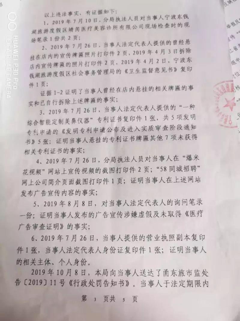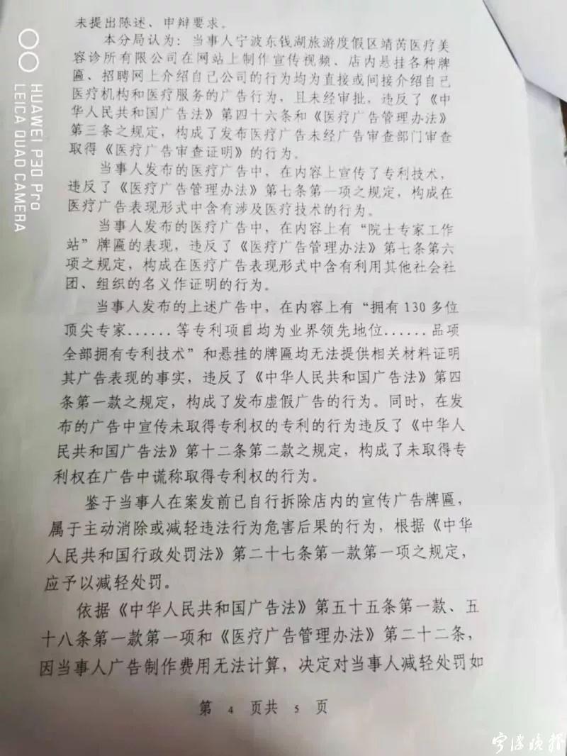 記者注意到,東錢湖市監(jiān)分局10月12日發(fā)布的行政處罰決定書中,認定當事人無法提供“浙江省胸整形修復基地”和“院士專家工作站”等8塊牌匾的相關授權材料,經核實“8分鐘極速豐胸專利技術”未獲得相關的專利證書和專利授權,當事人在宣傳上述醫(yī)療技術、診療方法等內容的廣告中未取得過《醫(yī)療廣告審查證明》……責令其停止發(fā)布廣告,在相應范圍內消除影響,并罰款20000元整。