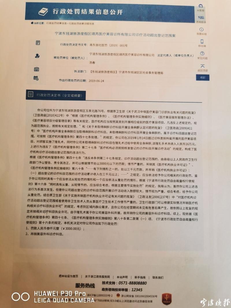 東錢湖社會事務管理局6月24日所做的行政處罰決定中,認定其超范圍經營,罰款3000元整并吊銷美容外科診療。