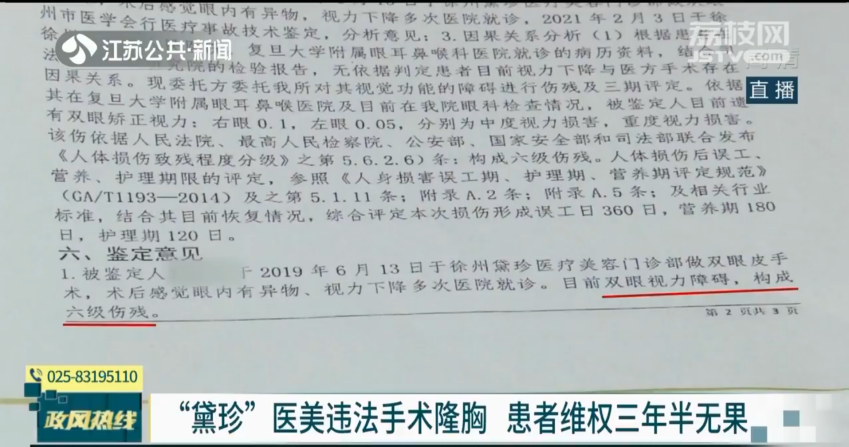 鄭女士告訴記者,由于徐州衛(wèi)生監(jiān)督部門對于黛珍醫(yī)美機(jī)構(gòu)提供的病歷調(diào)查結(jié)論是未按規(guī)定填寫病歷,再加上病歷內(nèi)容缺少手術(shù)麻醉方面的所有記錄,2021年2月3日,徐州市醫(yī)學(xué)會專家結(jié)合相關(guān)證據(jù)材料,給出鑒定結(jié)論:醫(yī)方使用未取得醫(yī)療美容主診醫(yī)師資格的人員獨(dú)立實(shí)施醫(yī)療美容項(xiàng)目,未按規(guī)定填寫病歷,超出核準(zhǔn)的診療科目開展隆胸手術(shù)和全身麻醉手術(shù);綜上分析,現(xiàn)有材料無法判定本案例是否構(gòu)成醫(yī)療事故。