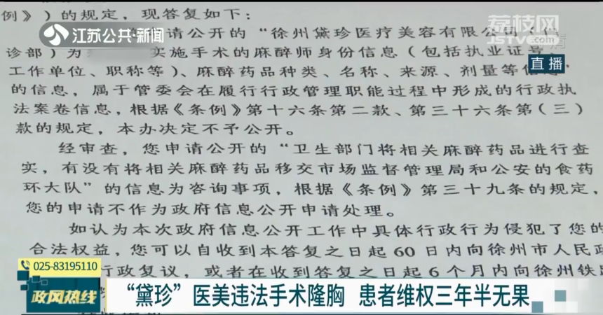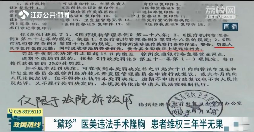 12月9日,省衛(wèi)健委綜合監(jiān)督處負(fù)責(zé)人趕到徐州督辦此事。在現(xiàn)場,徐州市衛(wèi)健委執(zhí)法人員約談了黛珍醫(yī)美機(jī)構(gòu)的負(fù)責(zé)人,檢查了患者病歷資料,了解到該機(jī)構(gòu)已停業(yè)許久。