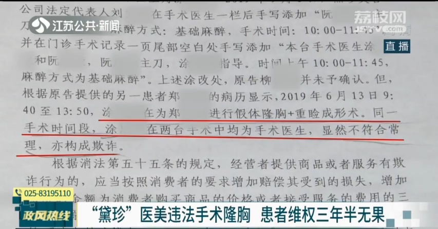 徐州經(jīng)濟(jì)技術(shù)開發(fā)區(qū)人民法院于2020年10月13日作出民事判決:涂醫(yī)生在為鄭女士進(jìn)行假體隆胸加重瞼成形術(shù),同一手術(shù)時(shí)間段,涂醫(yī)生在兩臺手術(shù)中均為手術(shù)醫(yī)生,顯然不符合常理,亦構(gòu)成欺詐。