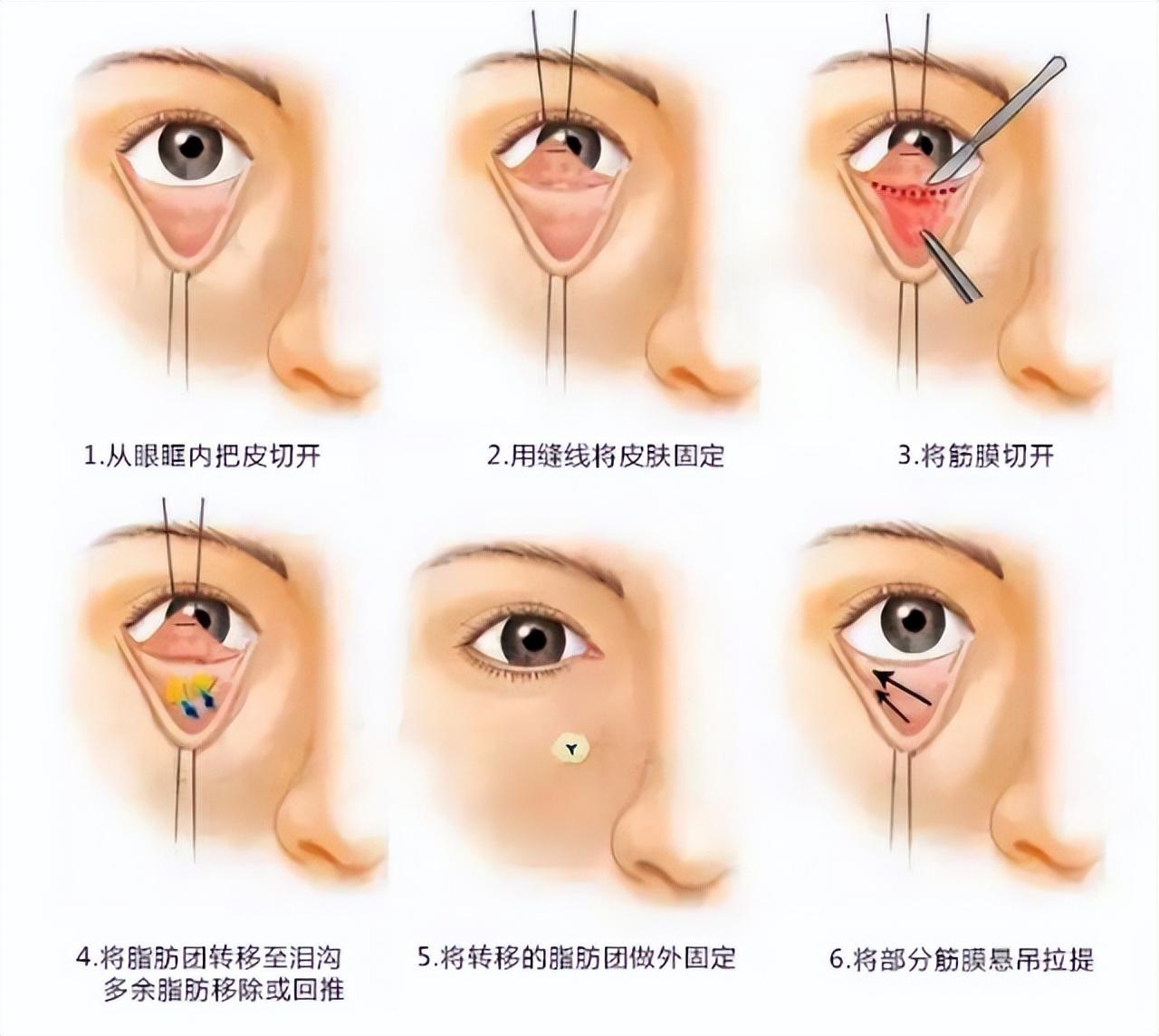 手術(shù)是將眶隔內(nèi)的脂肪釋放出來(lái),將它填塞固定在已經(jīng)分離好的眶下骨膜上,使凹陷平整,修復(fù)加強(qiáng)眶隔筋膜,懸吊松弛的眼輪匝肌到眶骨骨膜上,然后去除多余皮膚。適合非年紀(jì)變化導(dǎo)致的皮膚松弛型眼袋(適合各種眼袋人群)。