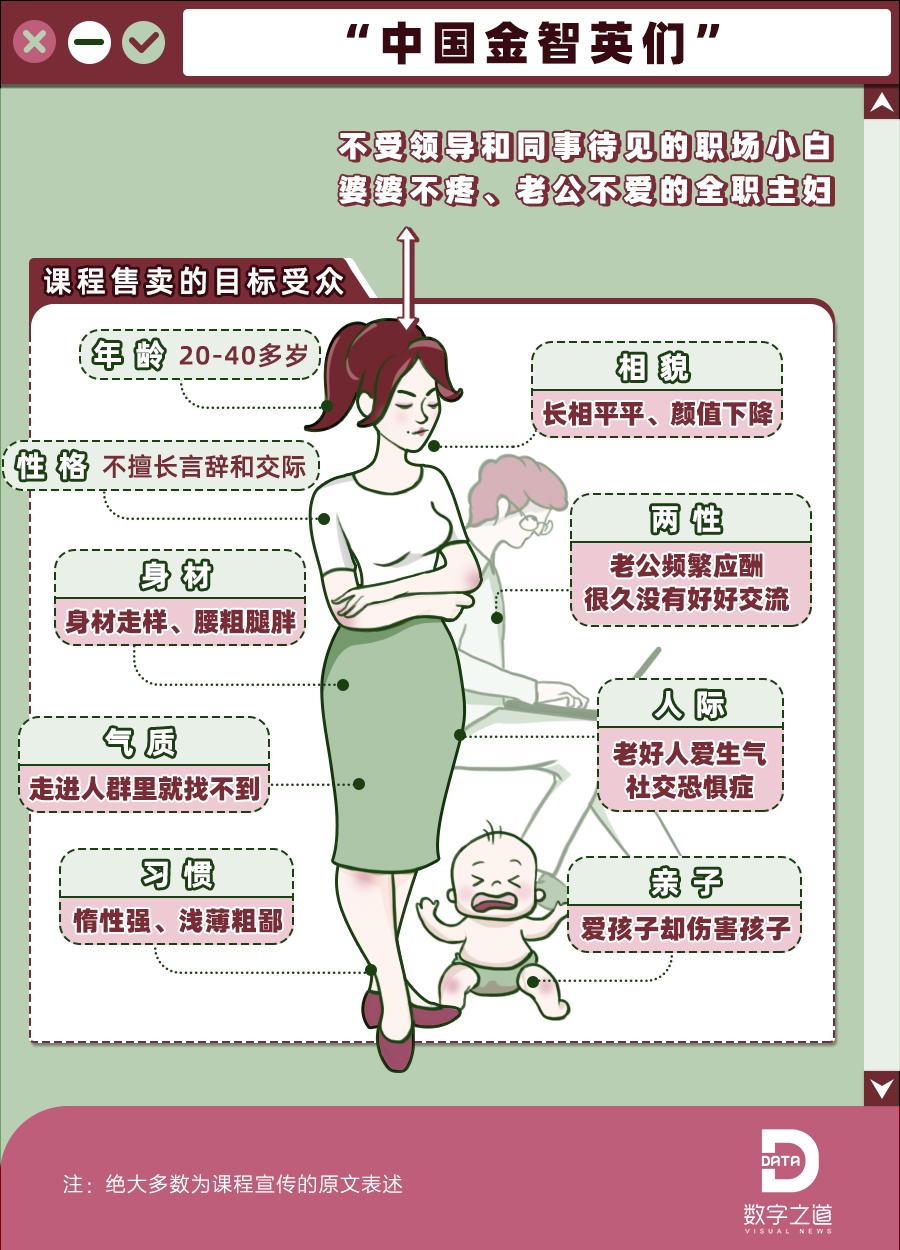 我們以某知名媒體集團(tuán)推出的“南X書院”為例,選取“個人充電”欄目針對女性的課程,分析了其“適用人群”的描述,勾勒出“中國金智英”的形象,她們構(gòu)成了這些付費(fèi)網(wǎng)課的主要收割對象。