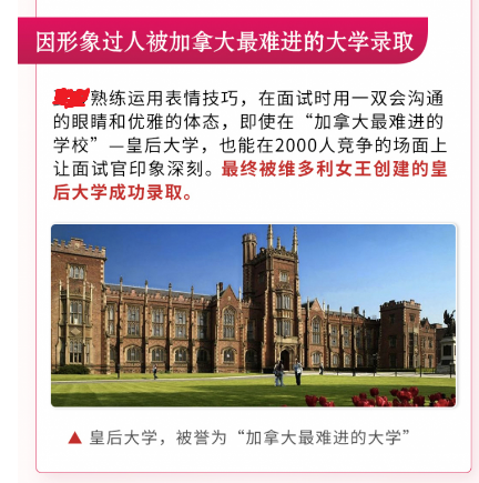還有所謂的“女性形體課”,宣傳靠形象過人被加拿大知名高校錄取。哪一年錄取的?本科還是碩士?什么專業(yè)?發(fā)的什么畢業(yè)證?單純“因形象過人而錄取”,如果這里的“皇后大學(xué)”指的真是Queen‘s University,應(yīng)該就是這家古老高校被黑的慘的一次。