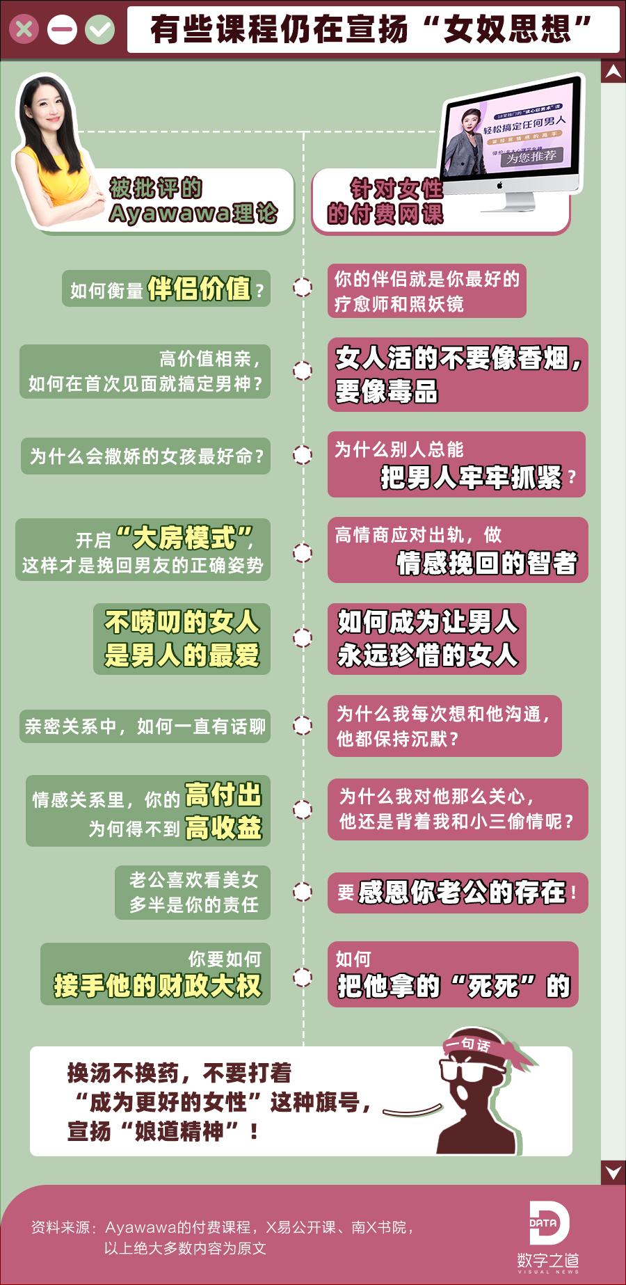 這么說吧,很多針對女性的情感付費(fèi)課,不過是Ayawawa女奴理論的變種。一個Ayawawa倒下了,其他Ayawawa還在活著散毒。