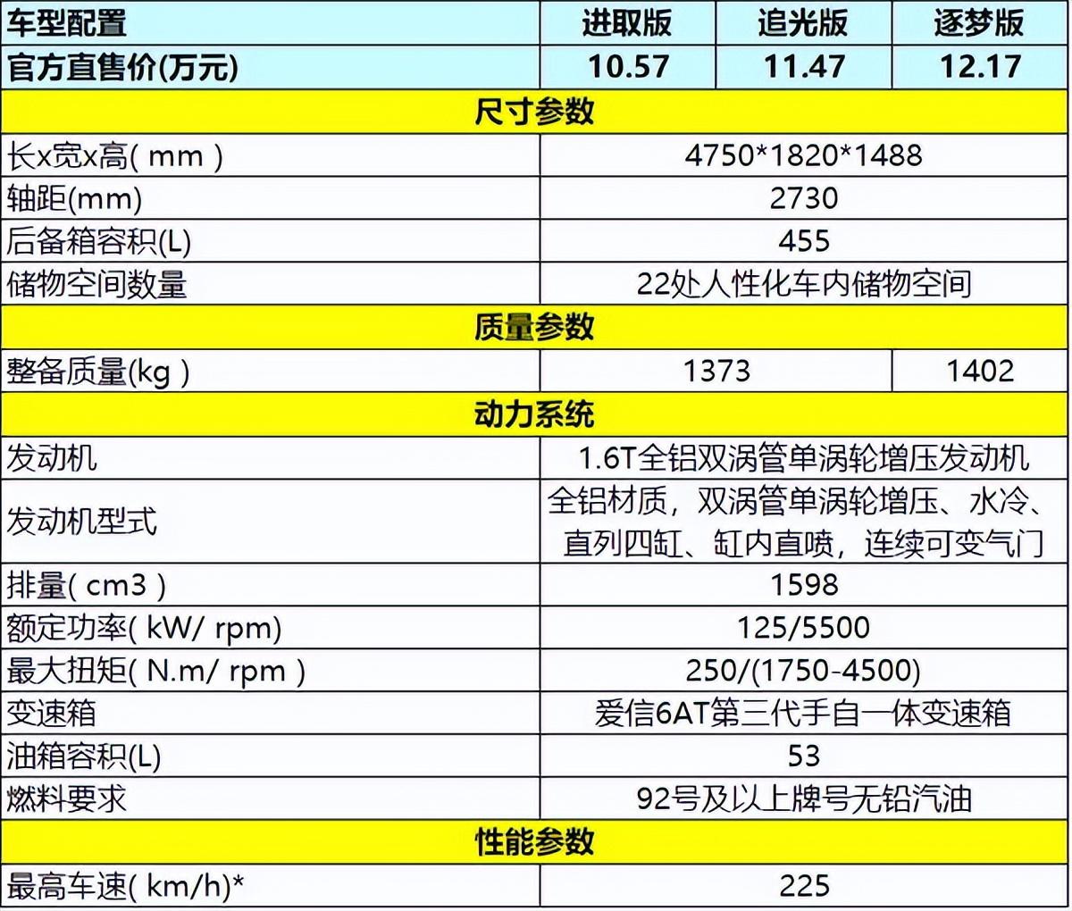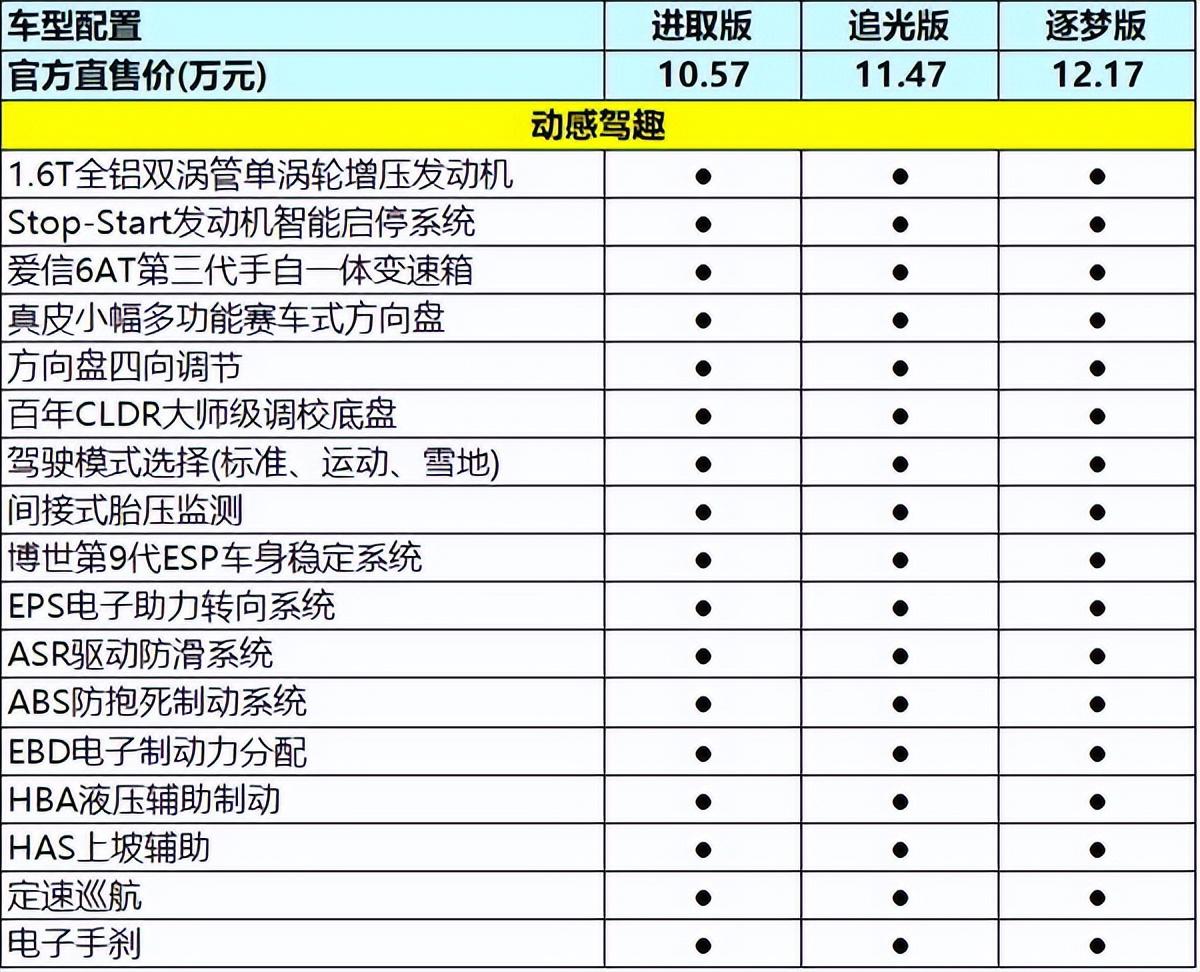 進取版、追光版,以及逐夢版同樣都配備了1.6T全鋁雙渦管單渦輪增壓發(fā)動機、Stop-Start發(fā)動機智能啟停系統(tǒng)、愛信6AT第三代手自一體變速箱、小幅多功能賽車式方向盤、方向盤四向調(diào)節(jié)、百年CLDR大師級調(diào)校底盤、駕駛模式選擇(標準、運動、雪地)、間接式胎壓監(jiān)測、博世第9代ESP車身穩(wěn)定系統(tǒng)、EPS電子助力轉向系統(tǒng)、ASR驅動防滑系統(tǒng)、ABS防抱死制動系統(tǒng)、EBD電子制動力分配、HBA液壓輔助制動、HAS上坡輔助、定速巡航、電子手剎。
