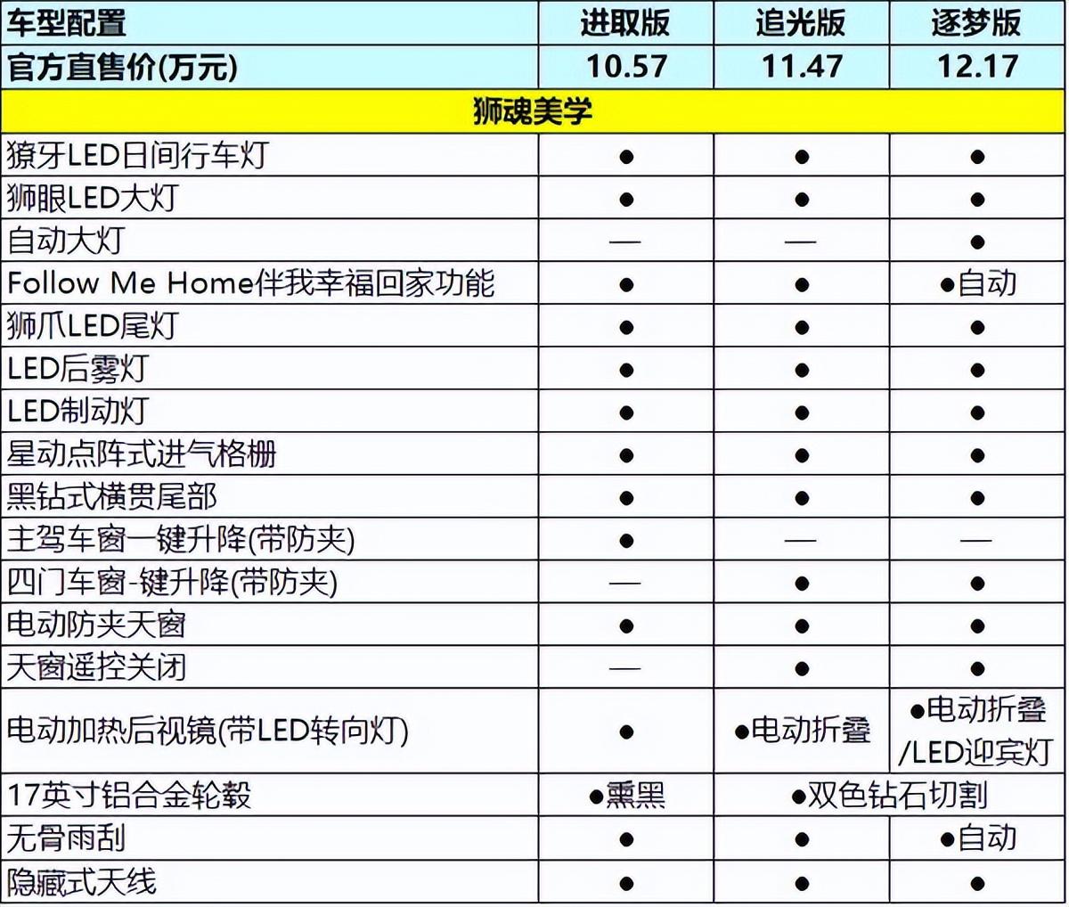 ① 進取版就已配備獠牙LED日間行車燈、獅眼LED大燈、Follow Me Home伴我幸?;丶夜δ?、獅爪LED尾燈、LED后霧燈、LED制動燈、星動點陣式進氣格柵、黑鉆式橫貫尾部、主駕車窗一鍵升降(帶防夾)、電動防夾天窗、電動加熱后視鏡(帶LED轉向燈)、17英寸鋁合金輪轂(熏黑)、無骨雨刮、隱藏式天線。